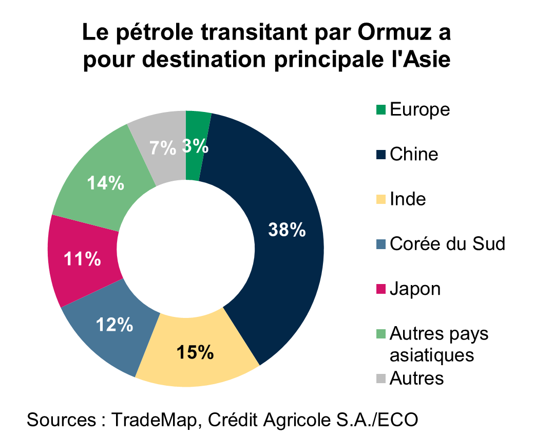 Si l’Asie émergente est confrontée à un double choc, sur les volumes et sur les prix, et que de nombreux pays de la zone ont déjà dû mettre en place des mesures de restrictions afin de limiter les pénuries (recours accru au télétravail, vitesse limitée sur les routes, rationnement à la pompe etc.), la Chine ne semble pour l’instant pas faire face à des difficultés d’approvisionnement. Bien qu’un peu plus de 40% de son pétrole importé vienne des pays du Golfe, et notamment d’Iran, dont elle était – de loin – le premier client, la Chine est en capacité de se tourner vers d’autres fournisseurs, au moins à court terme, et notamment la Russie. Le pays dispose en outre de stocks stratégiques d’un peu plus de trois mois, et les autorités ont annoncé suspendre les exportations de pétrole raffiné, afin de garder leurs réserves.