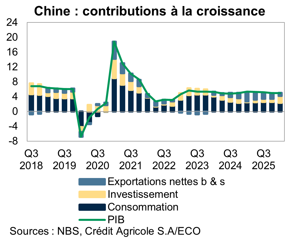 Cette économie de l’offre continue également d’être portée par un investissement soutenu. Si l’indicateur d’investissement global demeure sous pression en raison du secteur immobilier, qui se contracte pour la sixième année consécutive, les investissements manufacturier et en infrastructure ont accéléré. Il profite d’une hausse de la dépense publique et de l’orientation des fonds vers de nouveaux projets, liés pour la plupart aux nouvelles forces productives (économie de la transition et de l’innovation).