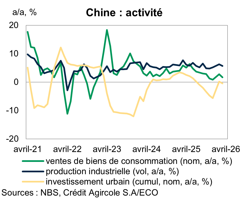 Les ventes au détail, qui avaient connu une légère accélération en début d’année, portées par le Nouvel An et des vacances plus longues, se sont de nouveau essoufflées. Alors qu’elles intègrent maintenant les services numériques, ce qui rendra les comparaisons en glissement annuel moins rigoureuses pendant un an, leur croissance s’est élevée à 1,7% en mars. À de rares exceptions près (mai 2025, par exemple), la dynamique des ventes au détail demeure très inférieure à celle de la croissance, et se décorrèle également de plus en plus de la courbe de la production industrielle, dont la croissance se maintient au-dessus de celle de l’activité générale.