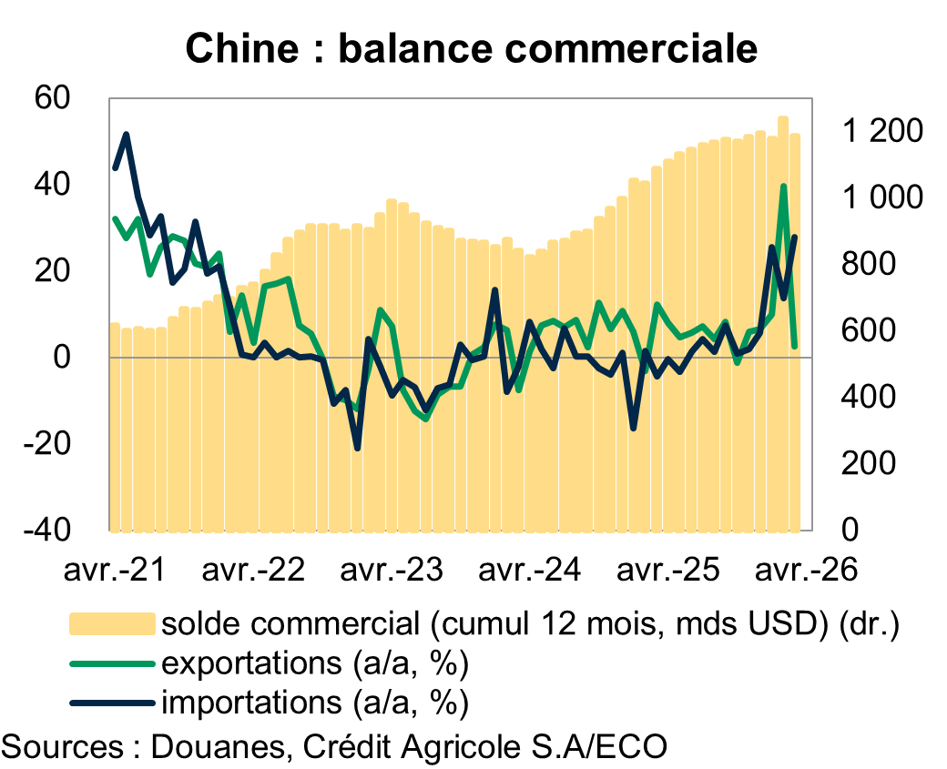 En parallèle, les exportations chinoises ont continué d’augmenter, mais bien moins rapidement que sur les deux premiers mois de l’année (+2,5% en mars, +21,8% en janvier-février), notamment en raison du ralentissement de la demande mondiale en produits finis, les consommateurs ajustant déjà leur comportement pour faire face à la crise iranienne. Les importations ont quant à elles bondi de 27,8% (après +19,8% en janvier-février). Le solde commercial a légèrement diminué et est repassé sous la barre des 1 200 milliards de dollars. Ces données ont surpris le consensus, qui ne s’attendait pas à un tel ralentissement des exportations, ni à une telle accélération des importations.