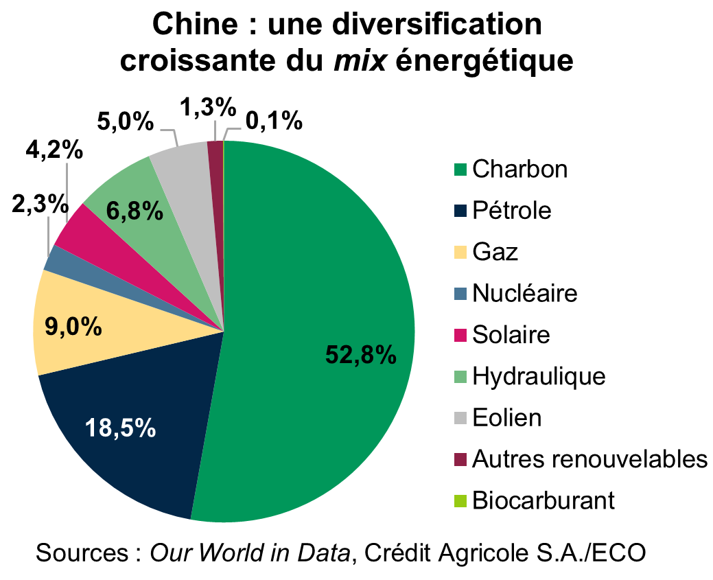 Elle vient tout d’abord conforter la Chine dans sa politique énergétique. Alors que le pays reste le premier importateur de pétrole mondial, la part des énergies renouvelables dans son mix énergétique a considérablement augmenté. La Chine ambitionne ainsi de transformer son système énergétique vers un mix dominé par les sources bas carbone : l’objectif d’installer 1 200 GW de capacités éoliennes et solaires d’ici 2030 a déjà été atteint, et le pays se dirige maintenant vers sa cible de long terme, la neutralité carbone à horizon 2060, avec des énergies renouvelables comptant pour 80% de la production d’électricité.