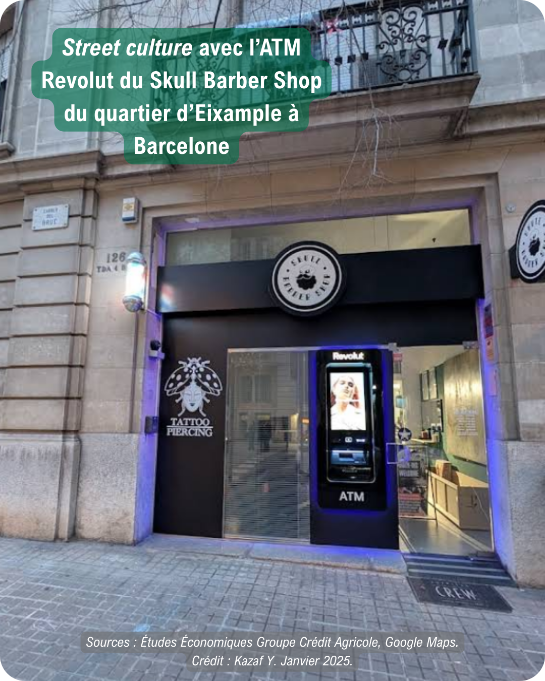 L’implantation de DAB chez les barbiers du Skull Barber Shop des rues Rocafort et Còrsega est plus audacieuse encore. Elle est révélatrice d’une volonté de fusionner avec la street culture. Revolut s’installe dans des espaces masculins, jeunes, soignés, où l’esthétique compte autant que le service. L’ATM n’est plus un utilitaire urbain, il devient un accessoire de décor, au même titre que le fauteuil en cuir vintage ou les LED au halo mauve bleuté qui enveloppent la façade de l’enseigne.