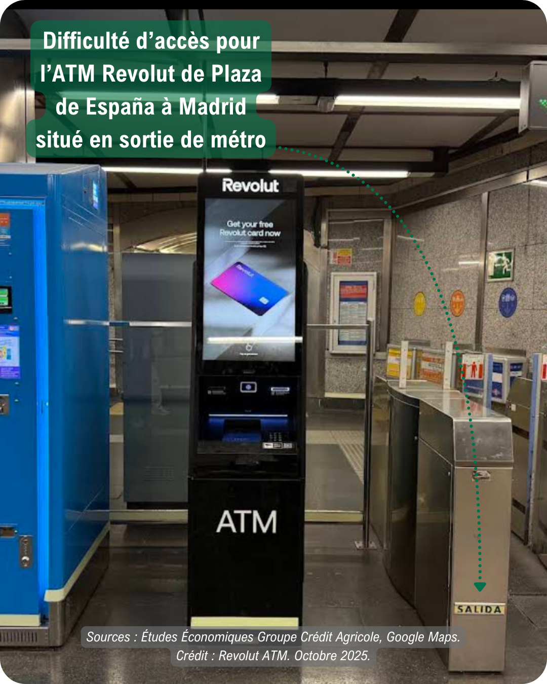 Cette configuration crée une situation absurde où l’accès à son propre argent est conditionné au paiement d’un titre de transport. À Madrid, Plaza de España, même constat : « Il faut prendre le métro pour l'utiliser [...] C'est un emplacement vraiment mal pensé ». Pour une banque qui a fait de la suppression des frais cachés son cheval de bataille, imposer de fait un « droit d’entrée »7 pour accéder au cash est une ironie mordante.