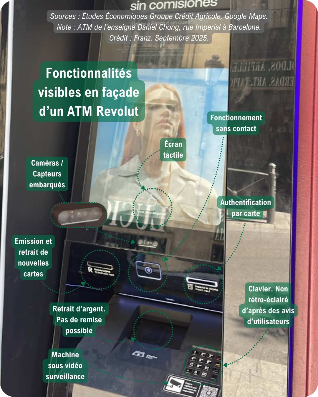 Chaque distributeur automatique de billets de marque Revolut identifié à Madrid et Barcelone a fait l’objet d’un relevé précis : localisation, environnement urbain immédiat, mode d’implantation, accessibilité, photos. Ceci afin de qualifier l’empreinte physique réelle du réseau des ATM de la fintech et d’en comprendre la logique d’intégration dans l’espace public.