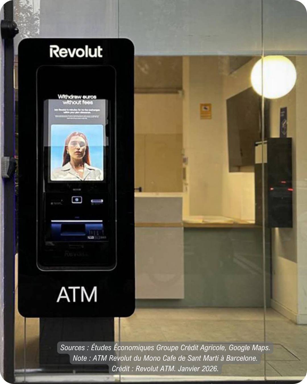 Intégré à la vitrine d’un café cosy et chaleureux, un imposant écran lumineux d’une élégante verticalité brise la nuit. Ce n’est ni publicité ni une installation artistique, mais bien un distributeur de billets de marque Revolut qui vient de s’installer dans un quartier résidentiel branché de l’est de Barcelone.