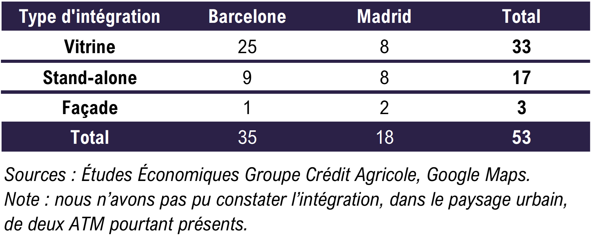 À Barcelone, les ATM sont majoritairement intégrés en vitrine (25) avec une présence notable d’ATM stand-alone3 (9). À Madrid, la répartition est nettement plus équilibrée entre ATM stand-alone (8) et vitrine (8). L’ATM seul en façade4 reste limité en nombre (3 au total5). Une différence entre les deux villes qui tient à des logiques urbaines singulières. Barcelone est davantage une ville de flux piéton et de petits commerces continus. Madrid est la capitale des grands volumes.
