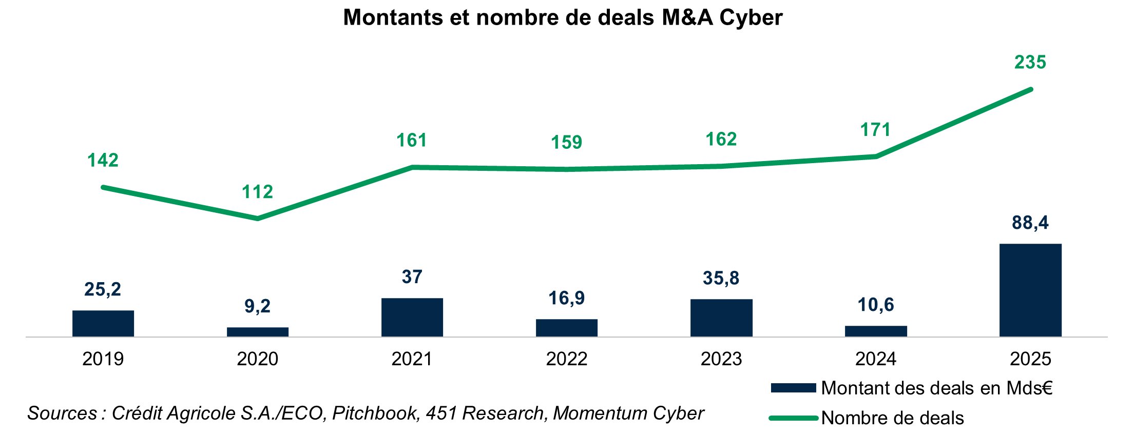 Nous anticipons davantage d'acquisitions liées à l'IA en 2026. Les entreprises de sécurité informatique et les hackers informatiques devraient intensifier leur utilisation des outils d'IA. L’IA continuera de rendre certaines cyberattaques plus efficaces et plus rapides, ce qui entraînera une multiplication du nombre total d’attaques, avec déjà une augmentation de 89% en 2025.