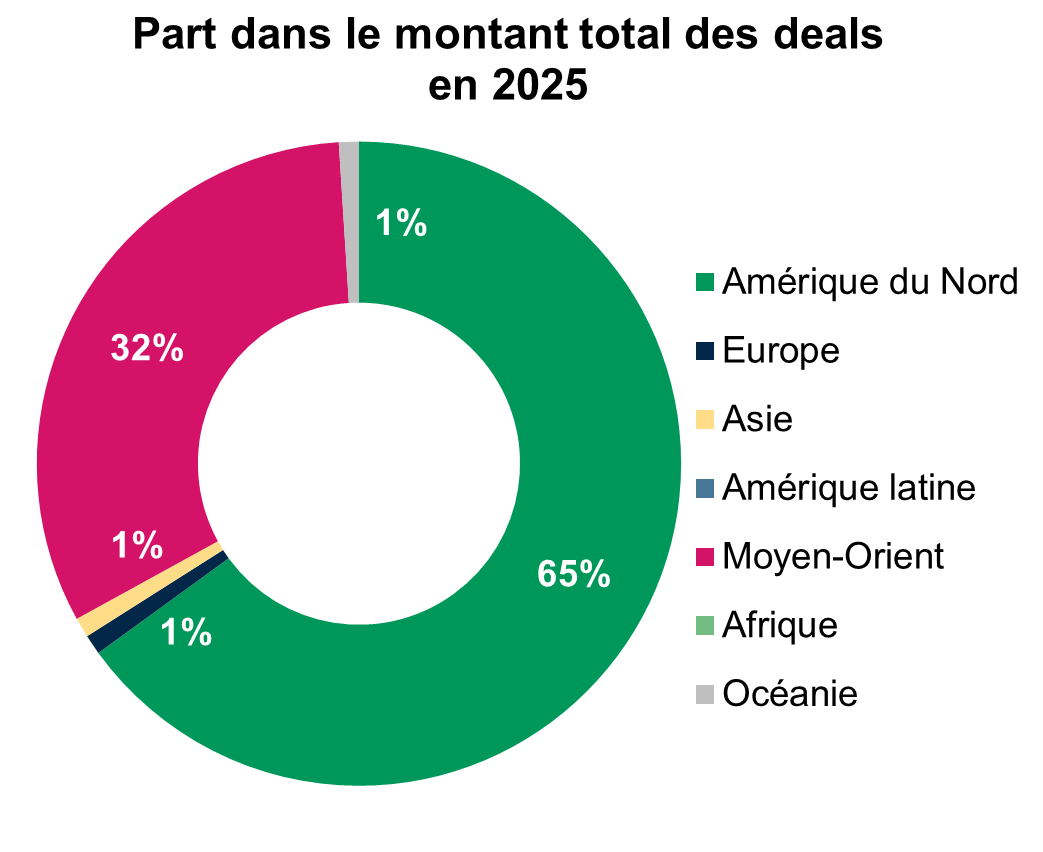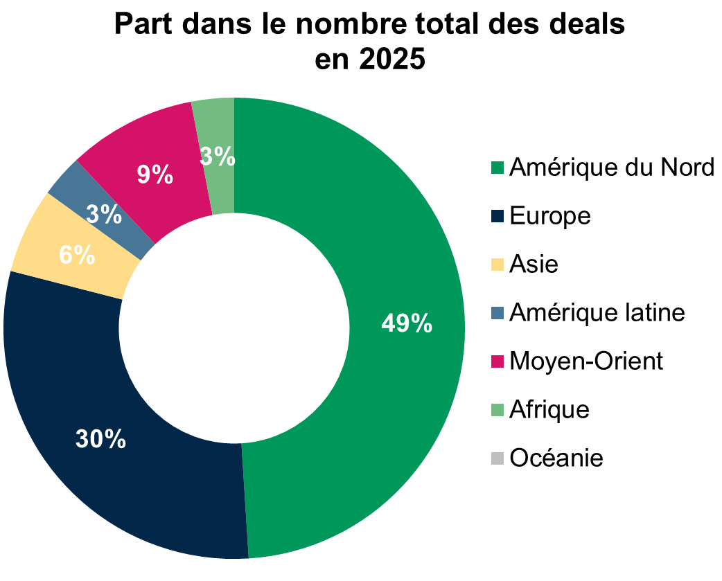L'Europe se positionne en deuxième place pour le nombre d'opérations réalisées, tandis que le Moyen-Orient occupe le deuxième rang en termes de montants investis, reflétant ainsi des dynamiques régionales distinctes dans le financement de la cybersécurité.
